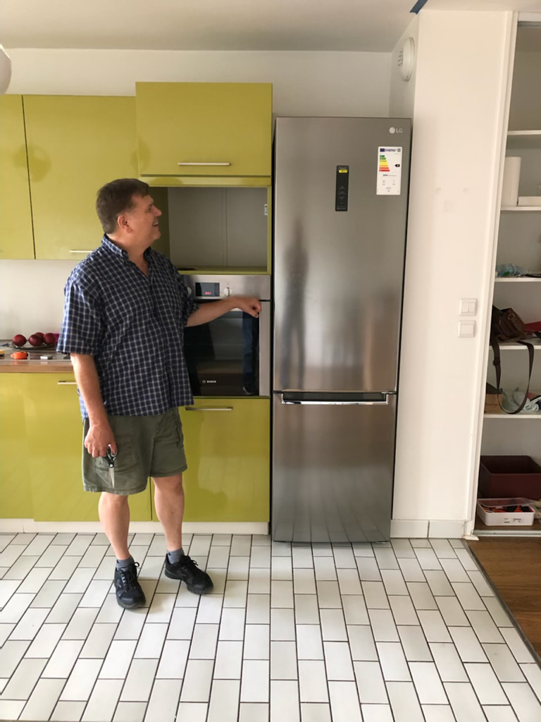 a guest bed (Léo’s bed), a buffet, a refrigerator (the tallest refrigerator I’ve ever seen)