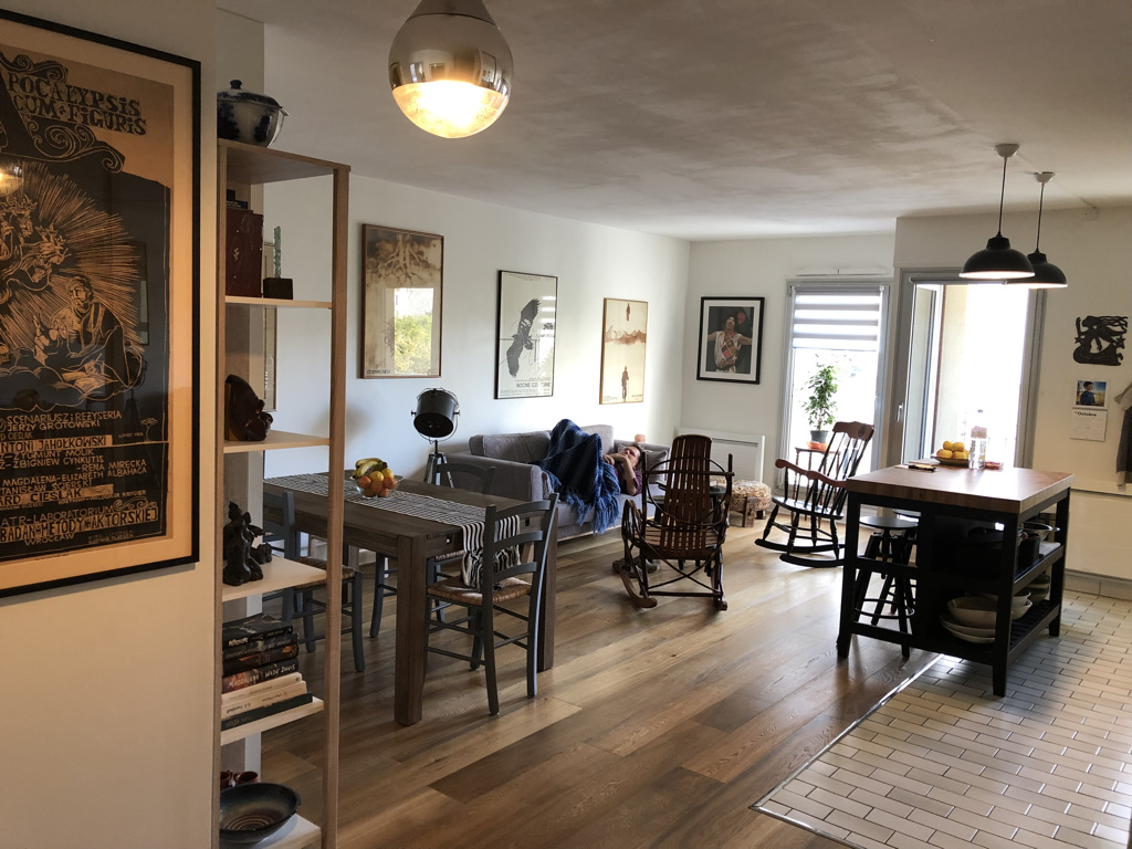 This brings me to my meditation for this posting. I’ve been thinking a lot about “home.” Maybe it’s because our recent collaborator, Josy Jones, is working on a project called Home back in Akron. But the question, “What is it that makes home?, has been haunting me since moving into our new abode. Having our Akron things around us, artwork and pictures hanging on the walls, bowls and books in place, will certainly create a more familiar atmosphere in the apartment, but is that what will create home? Certainly, our grandson playing in the space, making “snow” from the Styrofoam packing material, and building forts and castles with his abuelo from the cardboard boxes left from the multiple deliveries, will begin to forge memories and infuse our petite flat with a sense of play and transformation. But what makes a place “home?” In New World Performance Lab’s Performance Ecology work, Jairo talks about the body being the first “home,” oikos in Greek, from which we derive the terms ecology and the eco-system. Perhaps this is the key. Our bodies themselves are home and create home. Home is not one place. It is wherever “I” am. For us, it is the intersection of Jairo’s presence with mine. It is the inclusion of other “bodies” within that juncture: intimate lunches and dinners with Kena, Raphael, and Léo; hosting Viola, our first Akron visitor, for several gaga days before we were in any condition to receive guests; unruly and improvised vacation days with extended family on the west coast of France. Dare I say it without seeming too sappy? Home is not a place. Home is a condition. Home is another word for love.